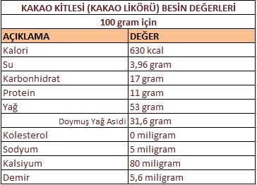 100 gr kakao likörü için yaklaşık besin değerleri aşağıdaki tabloda verilmiştir. Kakao likörü lif değerinin yüksek olması açısından oldukça faydalı bir besindir. Bunun yanı sıra içerdiği yüksek yağ oranı nedeniyle dikkatli tüketilmesi gerekmektedir.